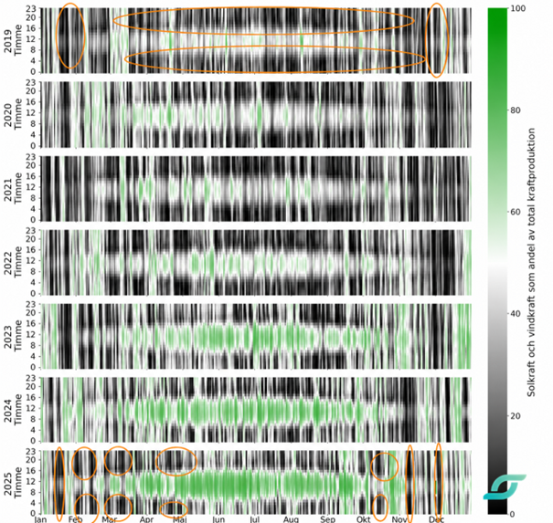 Utvecklingen kan ritas ut i en heatmap, som färgkodat visar för alla årets timmar hur stor andelen vind- och solkraft har varit av totalen. Ju mörkare färg, desto större andel termiska kraftslag. Ju ljusare och grönare, desto mer sol och vind har producerat elen.