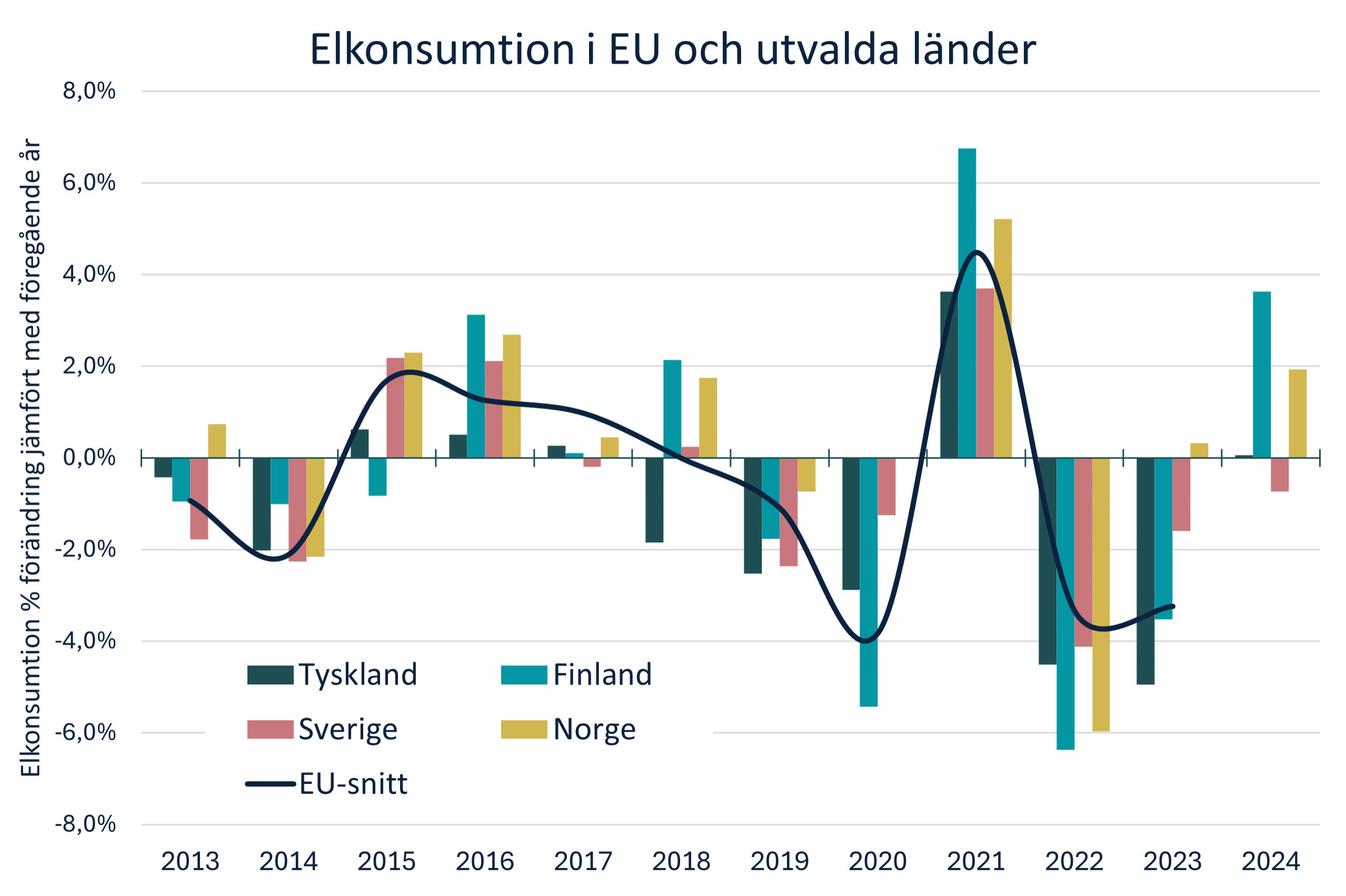Elkonsumtion och konjunktur: Förändringen i elkonsumtion från år till år går speglar den ekonomiska utvecklingen. Euro-krisen, pandemin 2020, stimulanserna under pandemin 2021 och inflationschocken 2022-2023 framträder tydligt. Källa: Sigholm, Eurostat