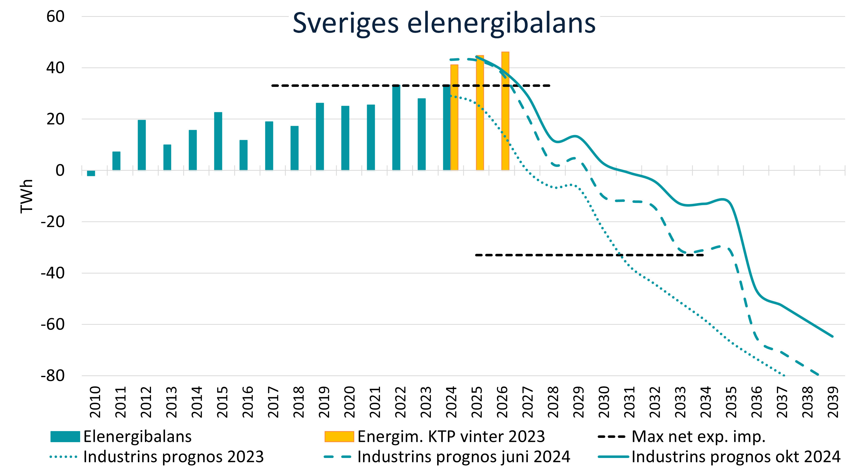 Energibalans i förändring: Sveriges elenergiöverskott har ökat stadigt och är större än exportförmågan på 33,4 TWh/år. Det innebär instängda volymer som pressar priserna. Men det kan vända fort. Källa: Sigholm, Statistikmyndigheten